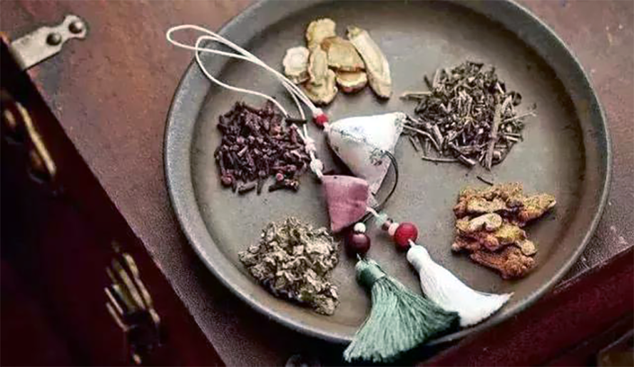 3、配香囊、悬艾草、缠丝符、饮雄黄:端午节小孩佩香囊,传说有避邪驱瘟之意,实际是用于襟头点缀装饰。香囊内有朱砂、雄黄、香药,外包以丝布,清香四溢,再以五色丝线弦扣成索,作各种不同形状,结成一串,形形色色,小巧可爱,现已成为一种普遍的工艺品。在中国某些南方城市,青年男女还用香囊来表达浓浓爱意。
