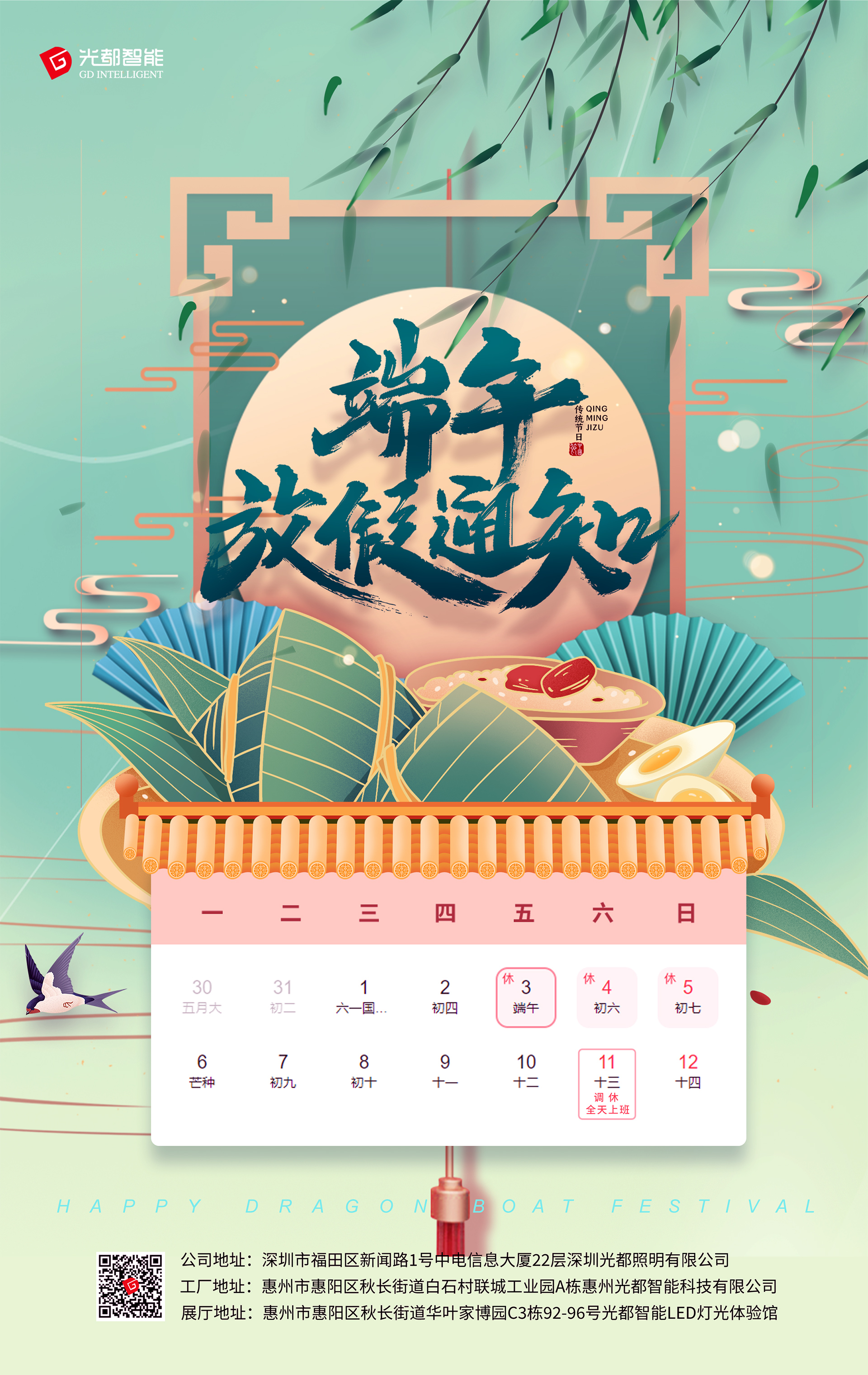光都照明|光都智能|光都光电:端午节放假时间为6月3-5日,6月6日恢复上班,6月11日周六全天上班(节日调休)。光都国内营销中心携全体员工祝福所有新老伙伴朋友家人们端午节快乐!粽情粽意!幸福安康!愿世间美好,接粽而至!勇毅前行,万粽一心!乘风破浪,不负粽望!