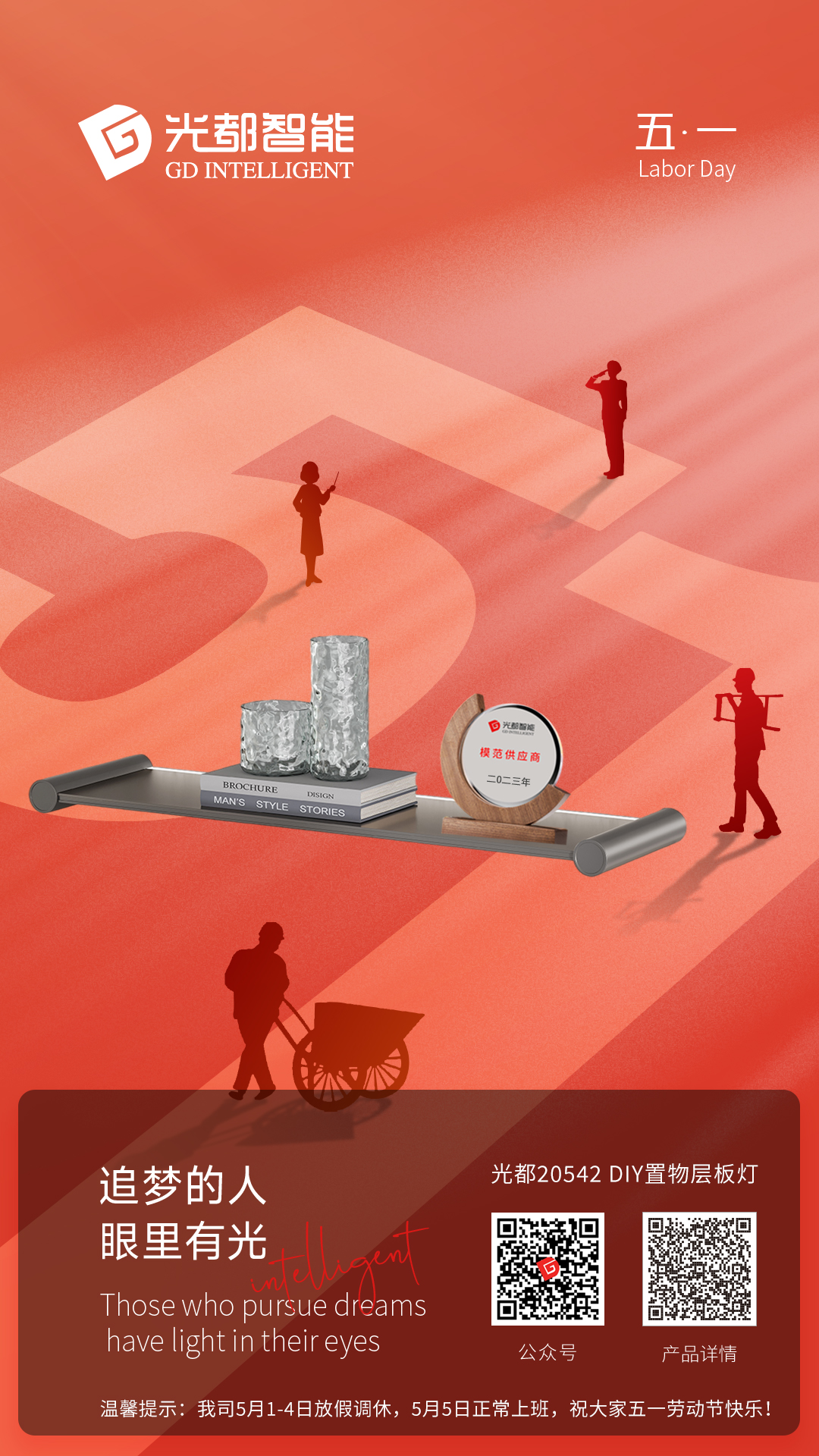 光都5月1-4日放假调休,2024年5月5日正常上班,光都照明携光都智能和光都光电全体同仁祝新老伙伴朋友家人们五一劳动节快乐!