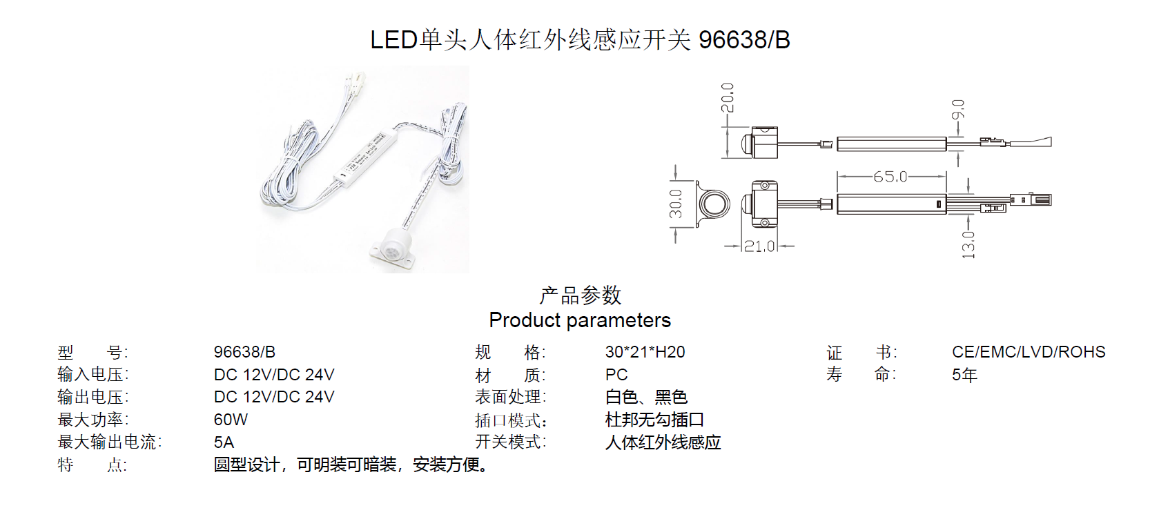 LED单头人体红外线感应开关 96648P